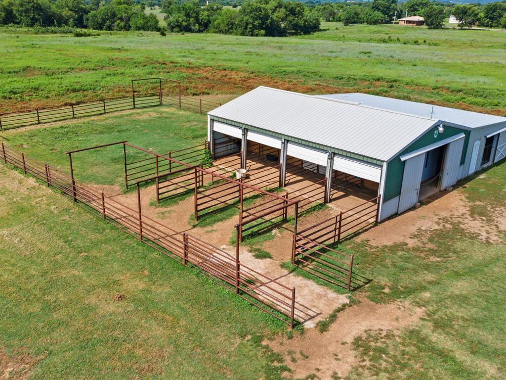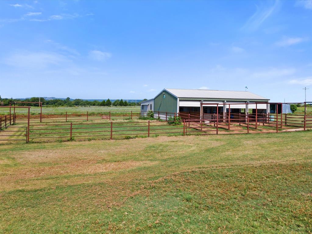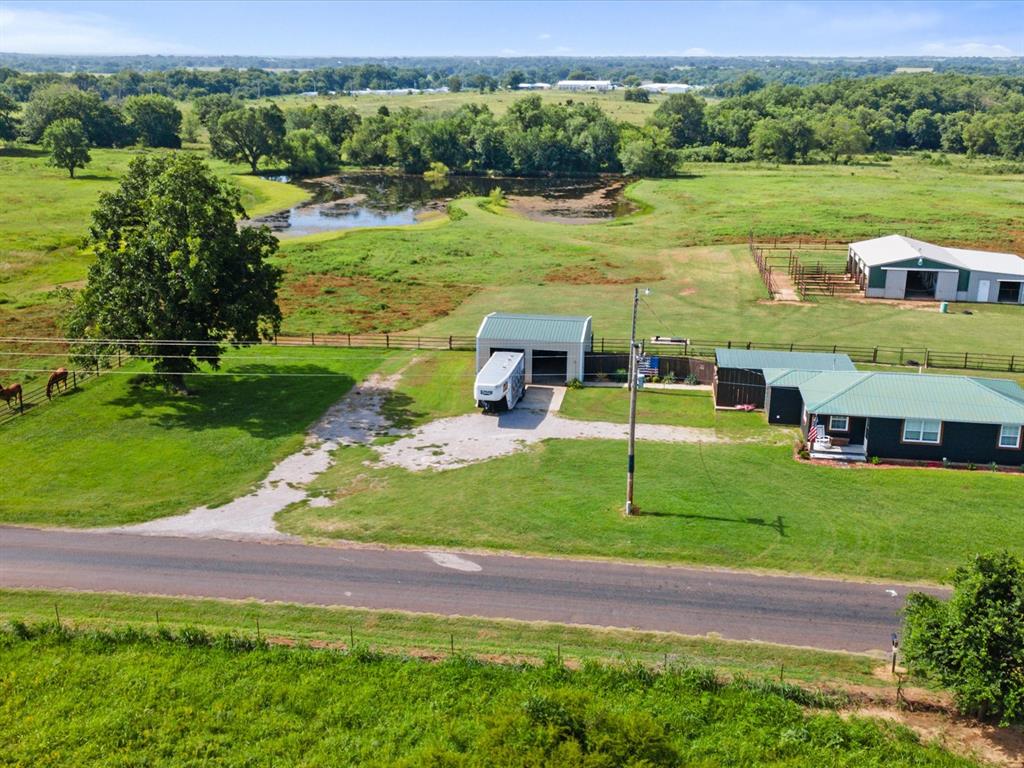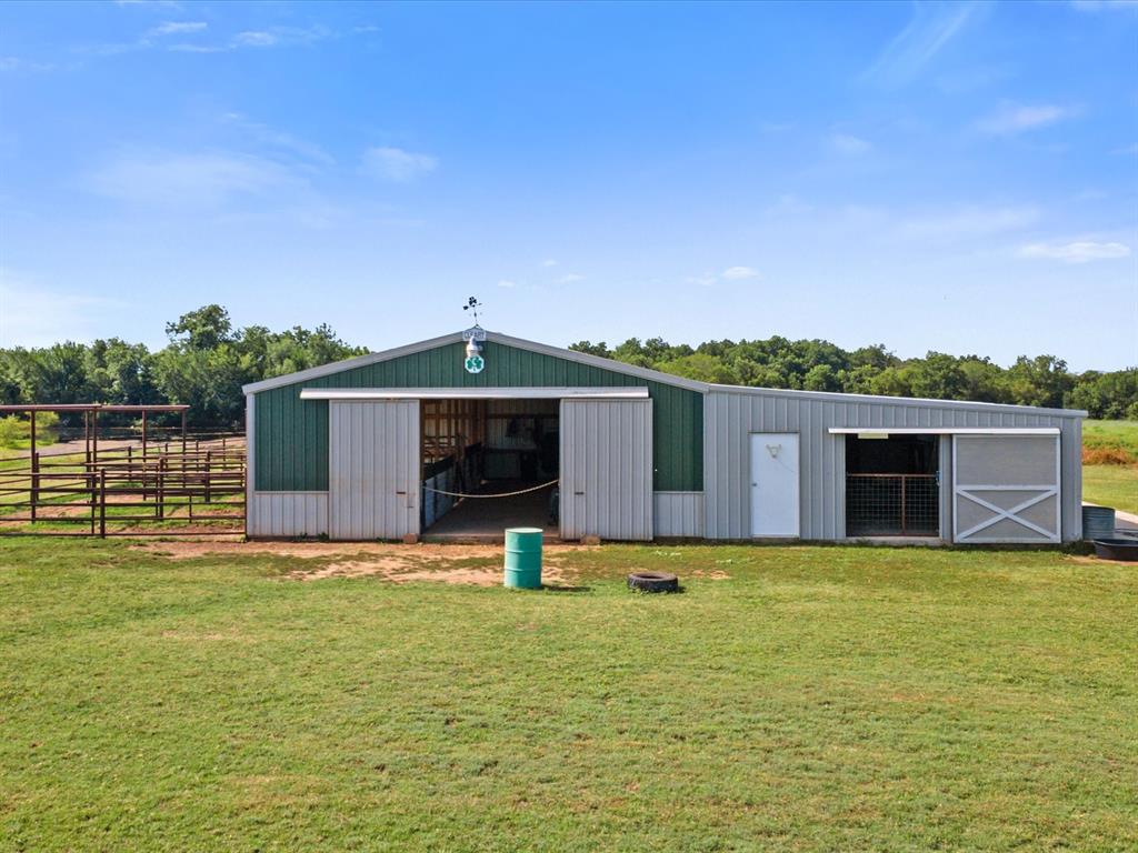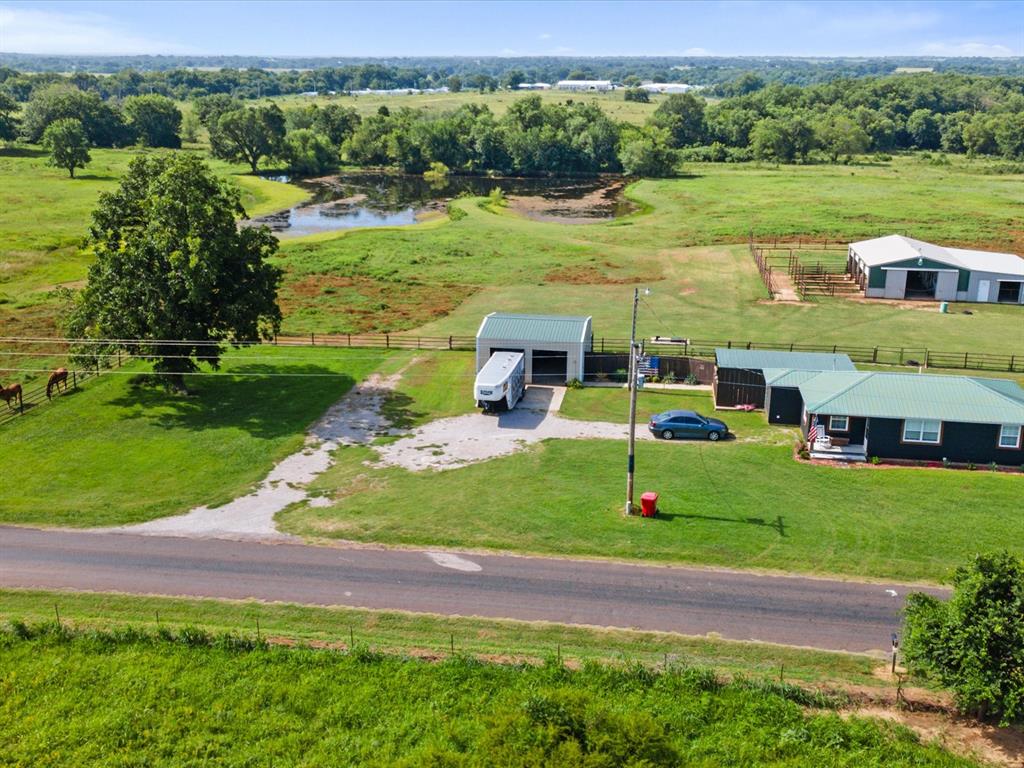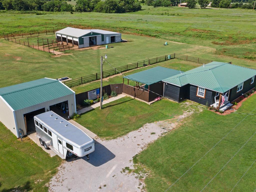 This updated property is ready for the horse enthusiasts or anyone seeking a fully equipped rural setup. The classic 2-bedroom, 1-bath home sits on 20 fully fenced acres and has been thoughtfully renovated inside and out. Enjoy real pecan hardwood floors throughout, an open-concept layout, and a spacious covered back porch that flows into a fenced backyard—perfect for relaxing or entertaining. Originally remodeled in 2017, the home received additional upgrades in 2024, including all-new interior paint and updated exterior siding in 2023. A storm shelter offers added peace of mind, and a 50-amp plug is available for RV or trailer hookups—ideal for guests or travel prep. Equine-ready and designed with care, the 30x40 main barn features a 28x40 addition, 4 horse stalls with individual 10x20 pipe runs, and a central 60x60 pipe pen. The barn includes a climate-controlled tack room, wash room with hot water, feed room, utility sink, ceiling fans throughout, and concrete floors with drains for easy cleaning and maintenance. A detached 2-car garage with concrete flooring adds even more storage and functionality. For those who love the outdoors, the 1.5-acre stocked pond offers a peaceful spot to fish or unwind. With unrestricted land use, this property provides the freedom to live, work, and ride on your own terms. Pre-approval or proof of funds required to schedule showings!