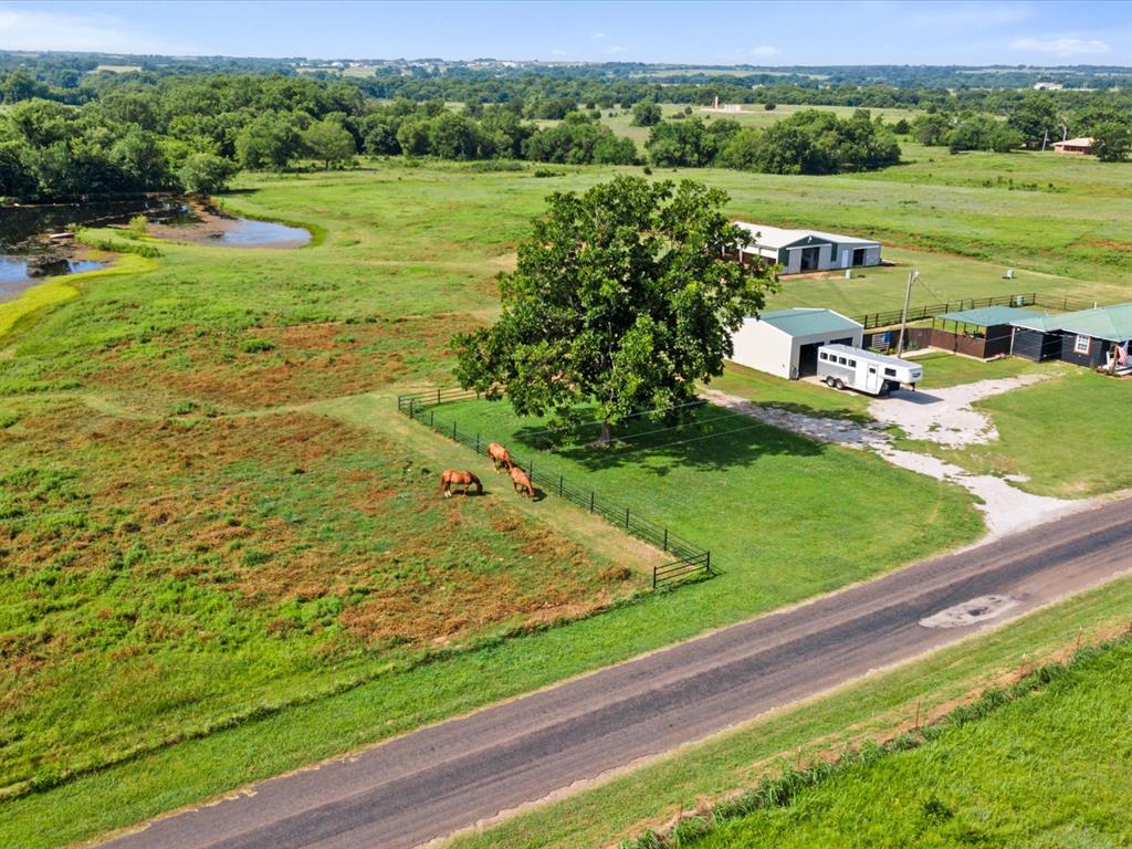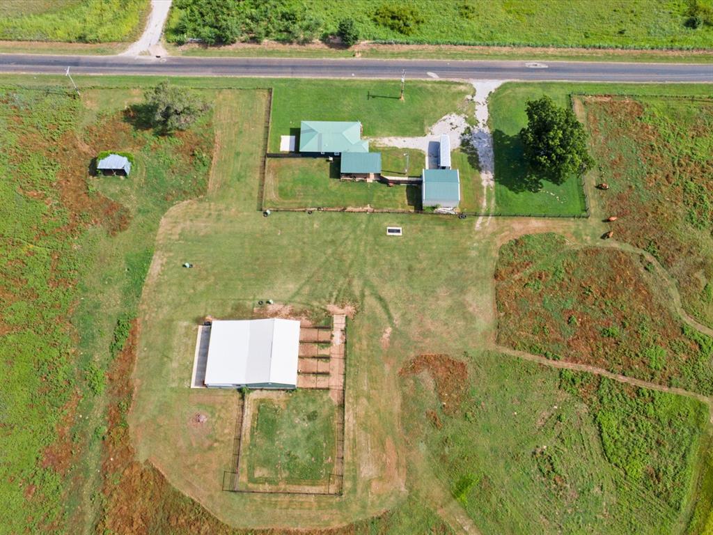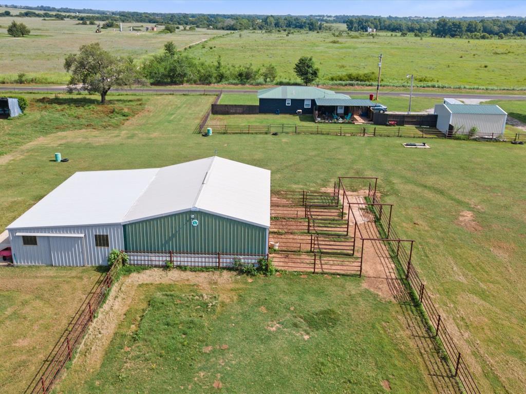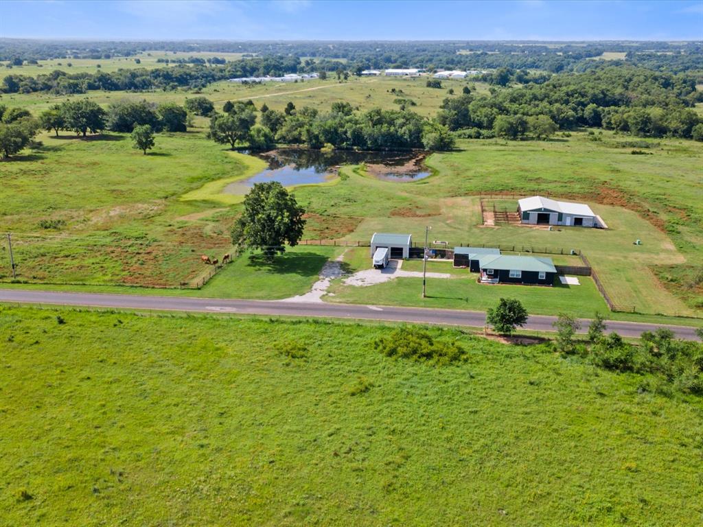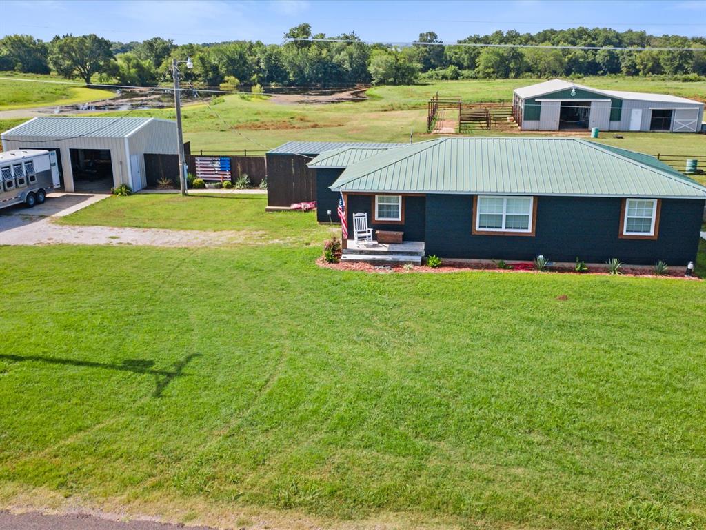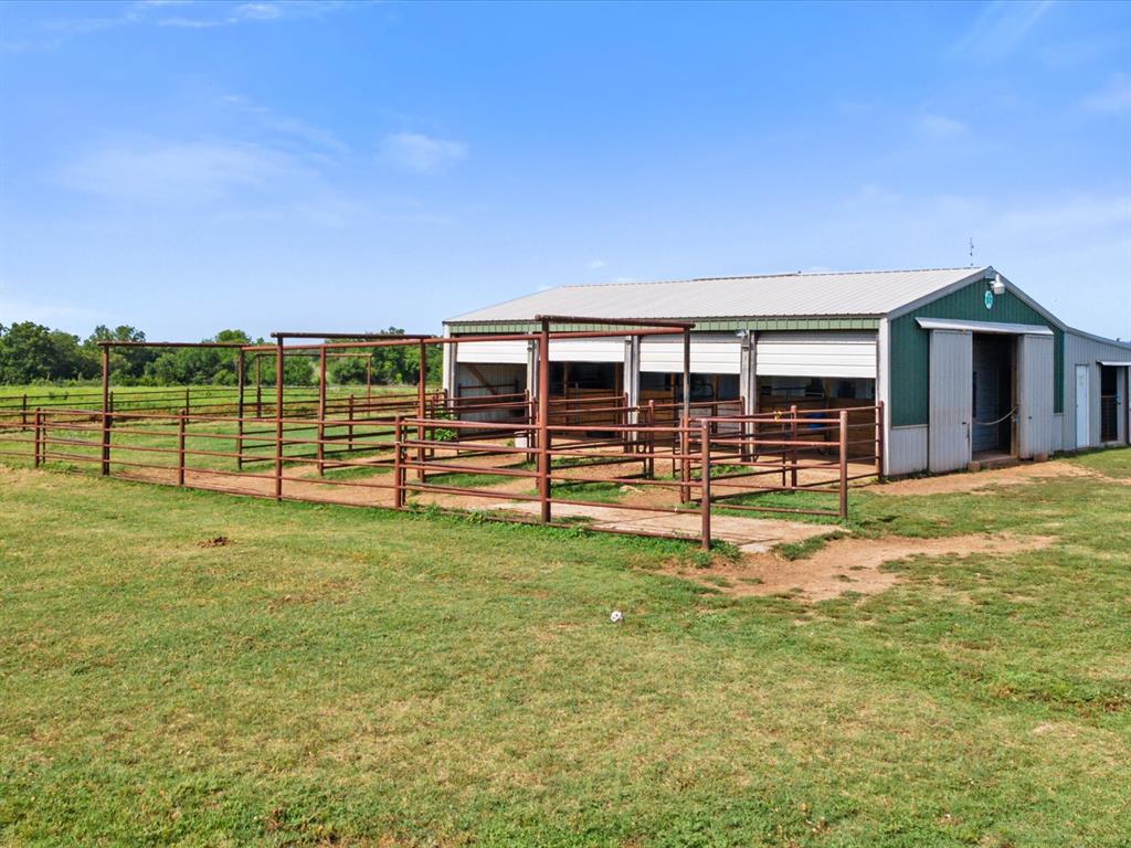 This updated property is ready for the horse enthusiasts or anyone seeking a fully equipped rural setup. The classic 2-bedroom, 1-bath home sits on 20 fully fenced acres and has been thoughtfully renovated inside and out. Enjoy real pecan hardwood floors throughout, an open-concept layout, and a spacious covered back porch that flows into a fenced backyard—perfect for relaxing or entertaining. Originally remodeled in 2017, the home received additional upgrades in 2024, including all-new interior paint and updated exterior siding in 2023. A storm shelter offers added peace of mind, and a 50-amp plug is available for RV or trailer hookups—ideal for guests or travel prep. Equine-ready and designed with care, the 30x40 main barn features a 28x40 addition, 4 horse stalls with individual 10x20 pipe runs, and a central 60x60 pipe pen. The barn includes a climate-controlled tack room, wash room with hot water, feed room, utility sink, ceiling fans throughout, and concrete floors with drains for easy cleaning and maintenance. A detached 2-car garage with concrete flooring adds even more storage and functionality. For those who love the outdoors, the 1.5-acre stocked pond offers a peaceful spot to fish or unwind. With unrestricted land use, this property provides the freedom to live, work, and ride on your own terms. Pre-approval or proof of funds required to schedule showings!