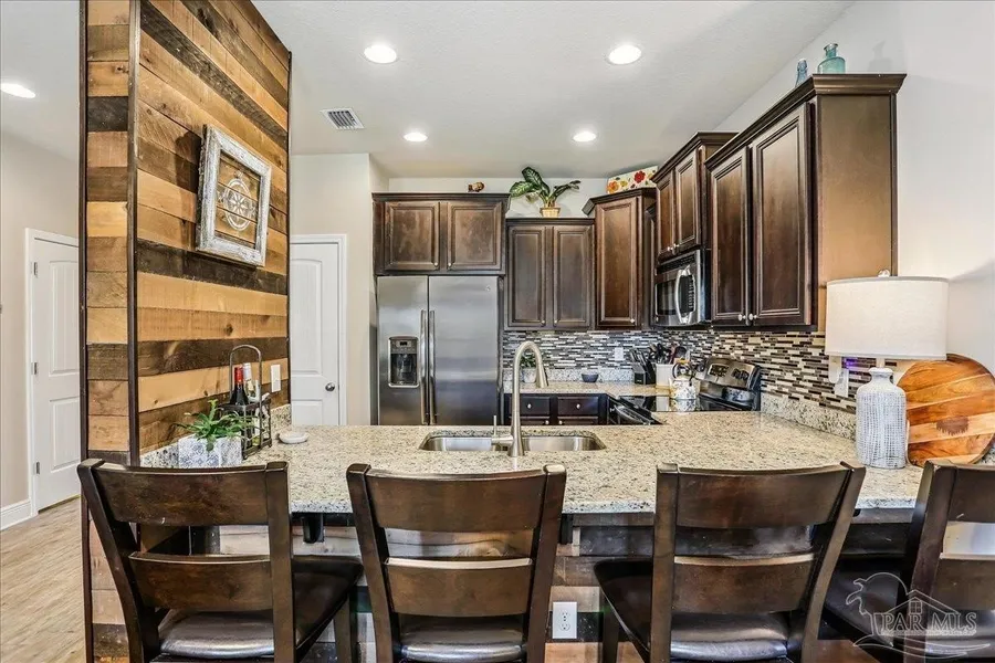 Welcome to this beautifully upgraded 3-bedroom, 2.5-bath townhome with an attached garage located in the highly desirable Reserve Pointe community. Perfectly positioned just minutes from Hurlburt Field, top-rated schools, dining, shopping, and the emerald waters of the Gulf of Mexico, this home offers the perfect balance of comfort, convenience, and coastal living. Inside, you'll find elevated finishes throughout, including 5-inch baseboards and durable luxury vinyl plank flooring on both levels—ideal for low-maintenance living. The kitchen features stainless steel appliances, granite countertops, rich dark cabinetry, and a breakfast bar that opens to the dining and living areas, creating an inviting open-concept space perfect for everyday living and entertaining. Stylish window coverings add a polished, move-in-ready feel. Upstairs, the spacious primary suite includes a walk-in closet and a private bath with double sinks, granite counters, and a walk-in shower. Two additional bedrooms, a linen closet, and a convenient upstairs laundry room offer modern functionality and smart layout design. Step outside to a private back patio—ideal for grilling, relaxing, and unwinding. The all-brick exterior provides timeless curb appeal and long-lasting durability. Living in Reserve Pointe means enjoying low-maintenance living with landscaping handled by the HOA, plus access to a community pool, playground, and walkable neighborhood layout. With low insurance costs, excellent location, and a well-maintained community, this townhome is perfect as a primary residence, second home, or military relocation property near Hurlburt Field.