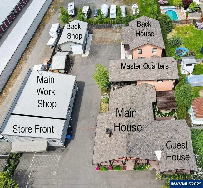 Luxury living meets rare opportunity—with four distinct living areas spanning over 5,000 sq ft, highlighted by heated travertine floors, rich woodwork, granite finishes, gas fireplaces, and a tranquil courtyard with koi pond. Originally built in 1904 and thoughtfully expanded beginning in 2012, this gated estate blends timeless craftsmanship with modern upgrades. The main home includes multiple living areas, while a separate 1,500 sq ft caretaker’s home offers its own kitchen, bedrooms, and living space. A guest suite and additional quarters add even more flexibility—perfect for multi-generational living, rental income, or extended mercial amenities include a 2,100 sq ft shop with storefront and half bath, a 960 sq ft rear shop, mill house, and loft. The property also offers a 4-car garage, carport, and RV hookups, with the driveway engineered to handle heavy trucks. Zoned General Industrial with a grandfathered residence, this unicorn property offers both luxury living and business potential, with projected rental income of approx. $10,000/month when fully leased. Too much to list here—contact the Listing Agent for a full property report with detailed specs and approved uses.