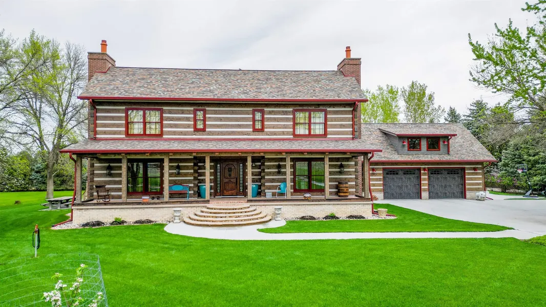 One of a kind, gorgeous, Stone Mill Oregon hand hewn timber home on acreage adjacent to Dakota Dunes. 5,366 total sq ft, 4 bdrm, 4.5 bath, 5 fireplaces. Bonus of fabulous Post & Beam Barn w/720 sq ft studio loft & electric fireplace, plus main floor garage w/ 1656 sq ft. & 1/2 bath. This custom home has every detail covered and desire met. From the front porch w/ custom train rail border, this home has "detail" with a capital "D". As you enter through the custom front door unto the hand selected tile, you are stepping into shear pride of ownership. The great room displays the custom designed jaw dropping staircase with hand selected pieces for treads and railing, which overlooks the 20 ft vaulted timber ceiling and Rumsford fireplace w/Chiefcliff stone, pot crain w/ matching exterior fireplace on 552 sq ft back covered porch. This home has 4 bdrm, 4.5 baths, 4 gorgeous fireplaces (2 gas/2 woodburning), hickory hardwood floors throughout, tile baths, sitting/formal dining room, private library, open kitchen with granite tops, custom cabinetry, wlk-in pantry, farm sink and pot filler, awesome appliances. The main floor includes primary suite w/ copper accented gas fireplace, tiled ensuite w/ copper soaking tub and walk-in tile shower with custom tiles and walk-in closet. The second floor boasts the hickory floors, 2 bedrooms each with private 3/4 tile baths. Perfect for guests or a quiet spot to take a nap. Lower level has another gorgeous custom staircase and iron rail, polished concrete floors, reclaimed wood finishes, wetbar with copper sink, bedroom, 3/4 bath and safe room. All setting on sprinkled yard, with apple and peach trees, see docs tab for more details...