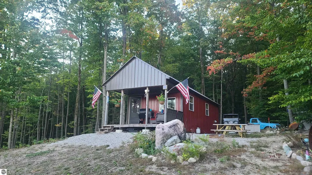 Beautiful 1 bedroom Amish cabin with loft, overlooking 10 wooded acres in the heart of Kalkaska County. The property is wooded and rolling, with nice trails throughout. The cottage has 2x6 walls, insulated for your round use, metal roof, 5' well, electric and propane fireplace. The home has a 1/2 bath with outside shower house. There is a new 24 x 24 barn with RV hookup. Great hunting property, and 30 minutes from Traverse City, and Cadillac. Close to golf course, casio, all sports lake Fife Lake, and the quaint town of Fife Lake where you will find your local shopping, restaurants, mad swirl ice cream, and your local hardware.