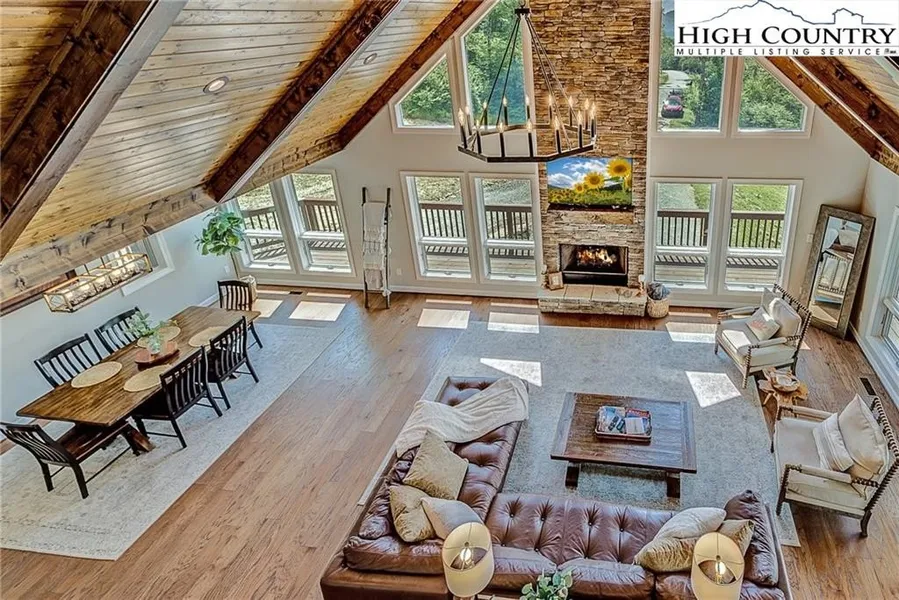 Just in time for summer! Perched at a almost 5,000 feet elevatio with long-range views, this ultimate mountain getaway offers some of the coolest summer temperatures in the Southeast. Whether you're dreaming of a serene full-time home or a high-performing vacation rental (grossing over $116K in 2024), this fully furnished luxury retreat checks all the boxes. Step into a spacious open floor plan where soaring tongue-and-groove cathedral ceilings and a warm stone fireplace set the tone for mountain comfort. Expansive windows flood the home with natural light and frame breathtaking southern views from nearly every room. The chef’s kitchen is designed for gathering, featuring a farmhouse sink, center island, generous prep space, and a sunny breakfast nook and dining area. Just beyond, sliding doors lead to a partially covered wraparound deck with a porch swing overlooking Sugar Mountain’s s...