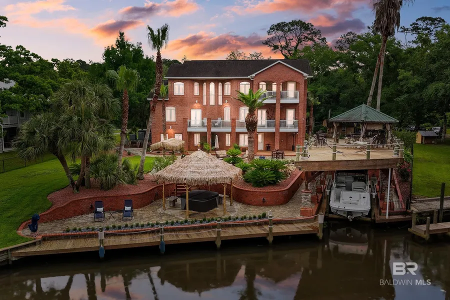 Welcome to this Exquisite three-story brick estate nestled in the bend of Fish River offering the perfect blend of timeless architecture and modern luxury. NO HOA!! Surrounded by lush tropical landscaping and mature trees, this stunning residence boasts Panoramic Water Views, a private dock with boat lift, and multiple outdoor entertainment spaces that evoke a private resort experience. From the gravel road, the gate opens and you pull up to the home on a paver driveway; get out of your car and walk up the beautiful brick stairs that leads to the decorative glass front door that welcomes you into a warm and welcoming home. Your eyes will immediately go to the high ceilings and then to the gorgeous view of the River. 3 BR 3.5 BT, each floor has its own bedroom and living/entertainment area. A 4th bedroom could easily be added. Newly Luxury vinyl plank floors installed, pre wired for a gen...