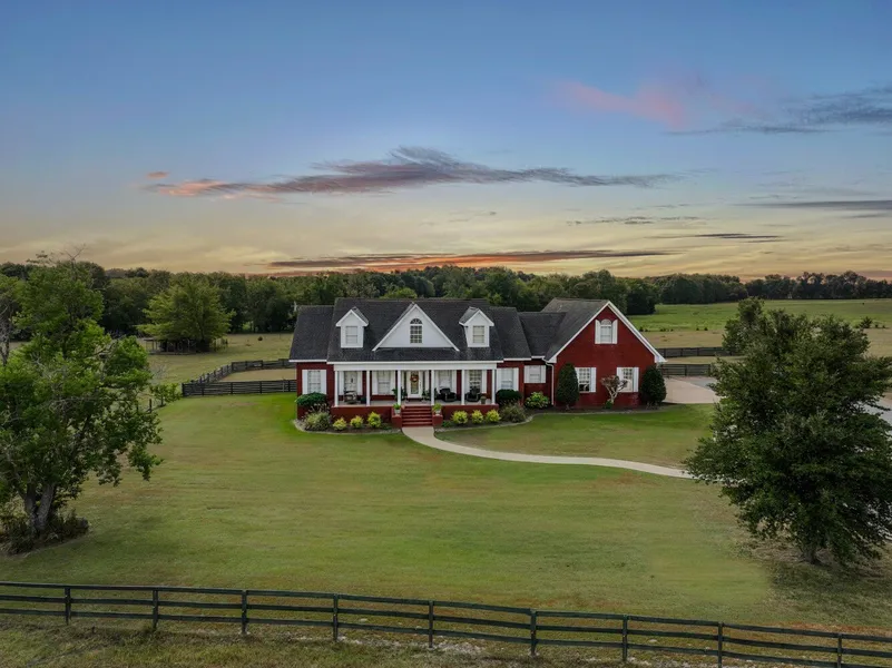 Just minutes from Demopolis, this gorgeous brick home sits on fenced acreage ready for cattle or horses. A private scenic drive leads to a welcoming front porch and spacious back patio. Inside, enjoy hardwood and tile flooring, a bright kitchen with stainless appliances, and a cozy living room with a wood-burning fireplace. The master suite offers a large bath, while two upstairs bonus rooms provide space for extra bedrooms, an office, or hobbies. The property also features an impressive cedar and cypress barndominium—a 4,560± sq. ft. barn with horse stalls and including a 964 sq. ft. living area complete with a central gathering space, custom bunks, and full bath. Perfect for entertaining, projects, or equestrian pursuits, this home blends country charm with modern convenience in a private, peaceful setting.