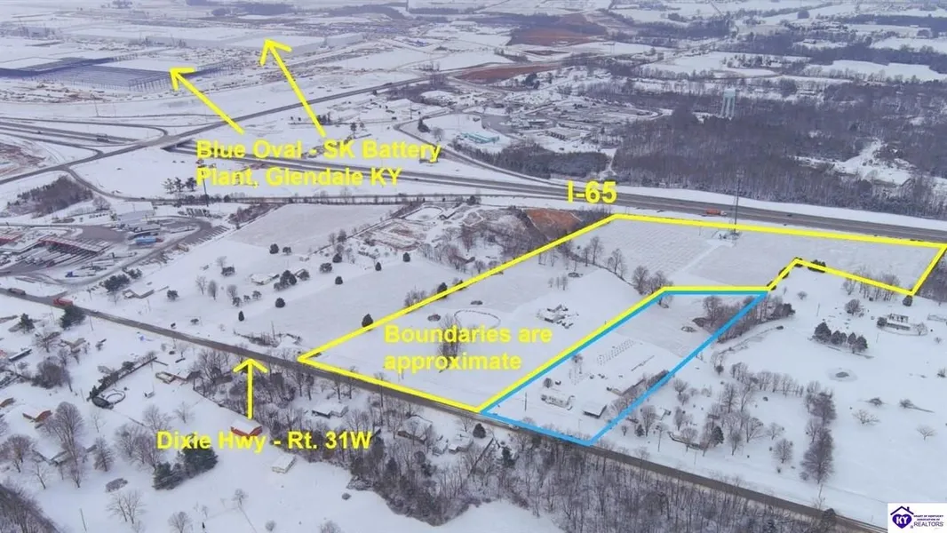 Located between I-65 and S Dixie Highway, this is prime location! Road frontage is on S Dixie Highway. The 16.28 acres includes 2 parcels with the opportunity to buy the 3.8 acres beside this 16.28 acres to make it a total of 20 acres. Residence on the property is included in the sale, however the mobile home on the property is not included in the sale.