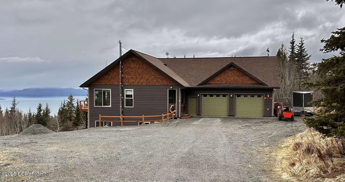 Enjoy stunning glacier, mountain and Kachemak Bay views from nearly every room in this 3 bedroom, 2 1/2 bath custom home on 4 acres. Enjoy carefree living with Everlast siding, large cedar upper deck, lower covered deck and large yard. 21 solar panels, wood stove and generator give you additional energy options besides the in-floor radiant heat system throughout the house and garage. The vaulted ceilings, open floor plan and expansive south facing windows offers plenty of natural light throughout. Custom cabinets in kitchen, top of the line appliances, pantry and solid surface countertops. Incredible views from the main level primary suite with a tiled shower, walk in closet and access to upper deck/fenced side yard. Downstairs: two more bedrooms, large rec room and walkout deck also enjoy that view. Large laundry and boiler room for extra storage. Finished room above garage! Close to s...