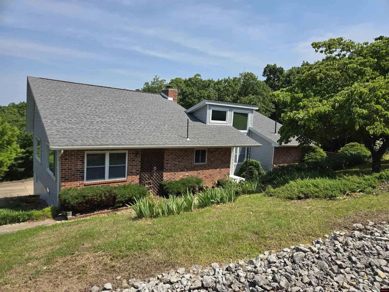 Charming home near Bull Shoals Lake; discover this unique 3 bedroom, 2.5 bath home, just a short walk from the Bull Shoals Lake. The property features a stunning open balcony that overlooks the lower level, highlighted by a striking 16-foot floor-to-ceiling fireplace, complemented by an additional fireplace on the main level. Meticulously maintained, this home boasts character throughout, with a spacious breakfast nook & den area adjacent to the kitchen. The compact kitchen is equipped w ample cabinetry & quartz countertops. Enjoy private decks off both the dining area & MB perfect for taking in the gorgeous, professionally landscaped surroundings. Benefit from low electric bills & 3 zoned geothermal heat pump. The main floor hosts the MB, while the lower-level features 2 additional bedrooms and a family room, ideal for entertaining guests or spending time with family. Nestled in a quiet lakeside neighborhood, this property offers plenty of privacy among beautiful hardwood trees.