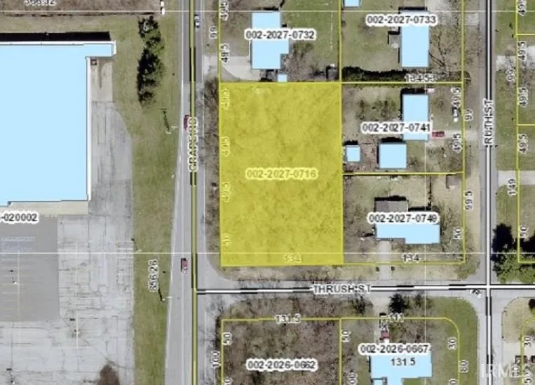 Nice parcel at northeast corner of Grape and Thrush. Tax info shows 199' frontage on Grape Rd and 134' on Thrush Street. The Mishawaka water department says that they have a water main on the other side of Thrush St and it may take about $4-5,000 to run a line across Thrush and put a connection on this side of the street. There is a screenshot attached in the MLS that was provided by NIPSCO showing the facilities they have at the front corner of the property.