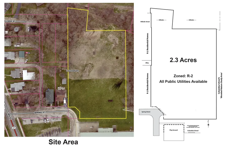 Looking for 2.3 acres of undeveloped land to build your dream home? On the Northside of the City of Logansport you will want to check-out this vacant meadow land with a few mature hardwoods and ready to unleash those creative building ideas. About half of the site is meadow and gently slopes to the south with the remaining site maintained as mowed lawn. The East neighboring property is the Columbia School - 'Wooded Nature Study Area'. Columbia Elementary School is located along the south property line. Along the west property the land is an established single family neighborhood. To the north the land is steep hillside. No septic system or well to worry about, all public utilities and all City services are available at the site. Direct access to the site from two paved City streets: Spring Street on the Southwest corner and Hillside Street on the Northwest corner of property. Al...