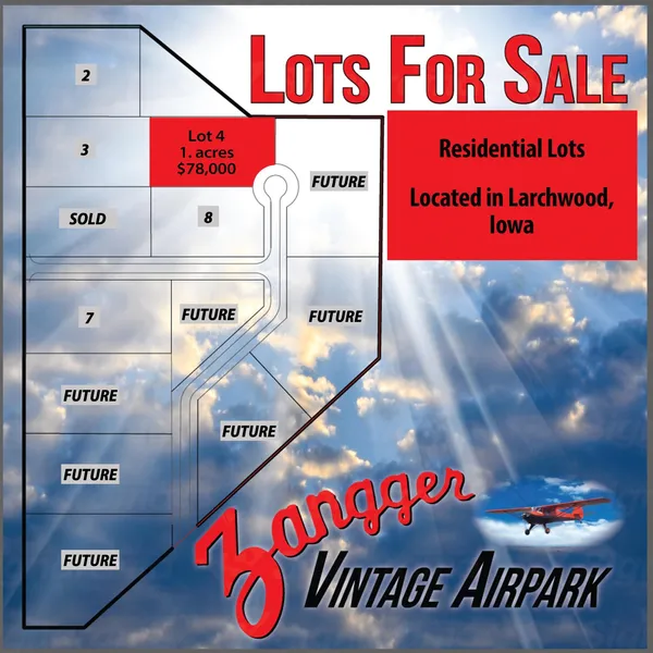 Residential lots just east of Larchwood, IA and situated on Zangger Vintage Airpark near the golf course. If you love all things aviation, this is for you! If you desire beautiful scenery just outside of city limits in small town Iowa - all while being a short 15-minute drive to Sioux Falls, this is also for you! The airport holds the distinction of being "vintage," not only for the fact of its age and historical importance to the Iowa aviation ecosystem, but also because "it's best suited for vintage, tailwheel aircraft," Jim said. Still, it has a runway suitable for anything up to a light twin and sees traffic from modern aircraft as well. (Quoted from a "Flying Magazine" article written May 2022). It is the oldest privately owned public use airport in Iowa and is the only one in the state with three runways. It is honored to be the first and, arguably, the only residential a...