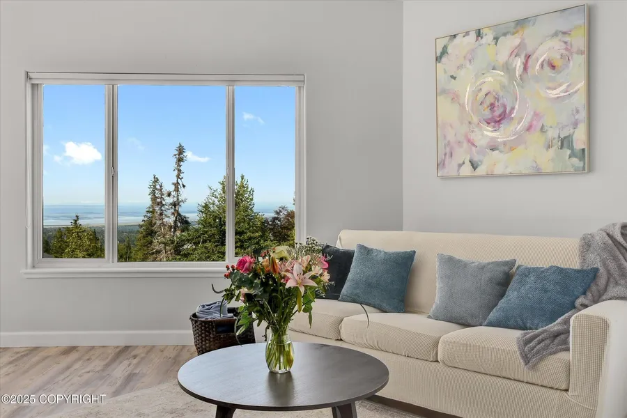 Quiet hillside Alaskan home on a peaceful half-acre with stunning views of Cook Inlet, Sleeping Lady, and the Anchorage skyline. Features 3 beds, 3 baths, an office, open-concept living with large view windows, wood stove, two decks, and a 3-car garage. Surrounded by trees with frequent wildlife sightings—comfort, privacy, and beauty in one.