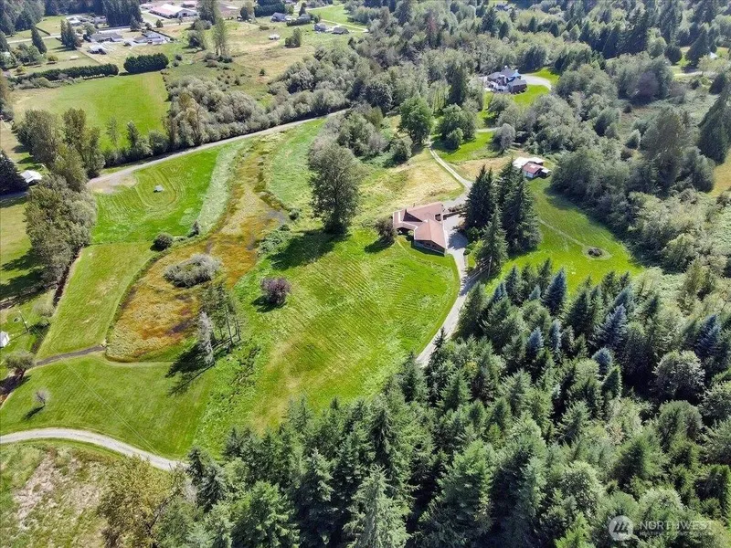 Experience timeless design and serene privacy on 27.8 acres with this Frank Lloyd Wright-inspired estate. With 5 bedrooms, 4 bathrooms, and 3,200 sqft, this architectural gem boasts a soaring beam ceiling, a wall of windows, and breathtaking panoramic views. Enjoy a separate entry upper-level MIL apartment, efficient geothermal heating, an attached 3-car garage, as well as a 3-bay shop and an RV pad with utility hookups. R5 zoning offers significant value with potential for future subdivision. Buyer to verify. Enjoy abundant wildlife, water features, and the nearby Centennial Trail. Minutes from town yet a world away— A rare blend of privacy, design, and opportunity—your exceptional Pacific Northwest legacy property awaits.