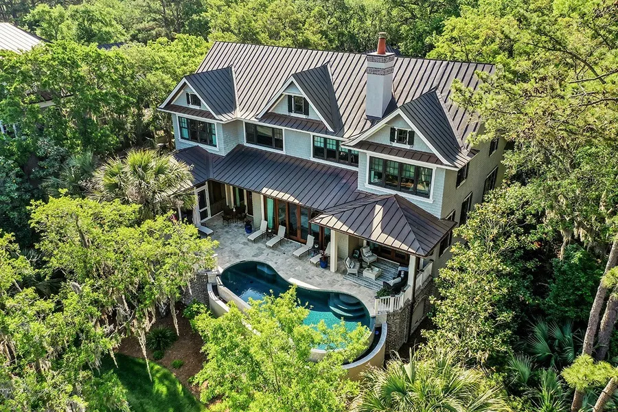 The shingle-style main house blends modern coastal style with elements of Victorian cottage architecture, including a steeply pitched central roofline with distinctive eyebrow dormer accent. Cedar shake walls are topped with copper roofing, and fine details—from the flared front staircase of Savannah grey brick and twin-columned covered front porch to the carriage garage doors and professionally lighted and landscaped grounds—abound. Outdoor living spaces...