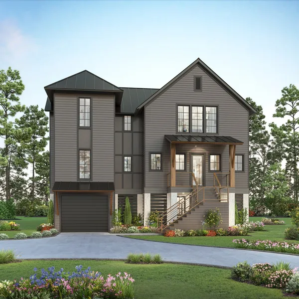 The home’s exterior will feature streamlined standing-seam metal roofs and walls of Hardie® Plank lap siding. Front square columns in natural wood with anchor the ends of the front porch, complete with modern wall lanterns and a glass door by Anderson®. A curving front drive will lead to a ground level with pier columns in tabby stucco, garage door in contemporary planks style, and ground-level louver slats of Hardie Soffit.