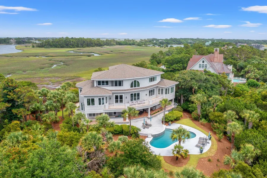 Additional features of this ideally placed estate, awash in spectacular views and offered fully furnished, include a workshop area in the ground-level four-car garage, mudroom, extra parking in the drive, elevator to all floors, impact-rated windows and doors, and sound, security, and irrigation systems. Nearby are the perennially popular Beach Club with its world-class dining and beachside cocktails, and strikingly designed Marsh House with its soaring roof lines, cocktail bar, grill, outdoor fireplace, and infinity pool deck overlooking the wide marsh and a tree line reminiscent of the African savanna.
