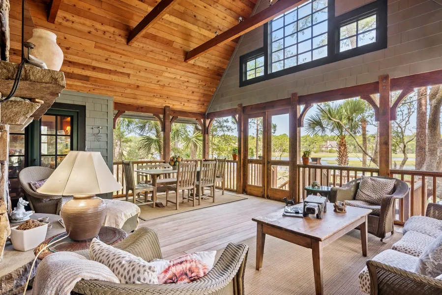 A stone fireplace along the far wall is double-sided, offering a gas hearth inside and a wood-burning hearth on the screened porch, where gatherings extend toward the creek. Glass doors and tall windows brighten the living space, while the porch functions as an outdoor room with its own hearth for cool evenings. From here, steps lead to a lower deck with space for grilling or seating before continuing toward the shared dock. Reclaimed pine floors from The Citadel extend throughout, bringing warmth and character to the open living spaces.