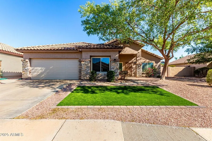 5 bedroom, 2 bath home in Parkwood Ranch in Mesa AZ. Bright interior with vaulted ceilings, formal living room, and an open family room. The kitchen offers black stainless appliances, granite counters, brick backsplash, espresso cabinetry, and an island with breakfast bar. A den with closet adds office or bedroom flexibility. The main bedroom includes dual sinks, separate tub and shower, and a walk in closet. The backyard features an extended paver patio, putting green, fire pit, and built in BBQ.