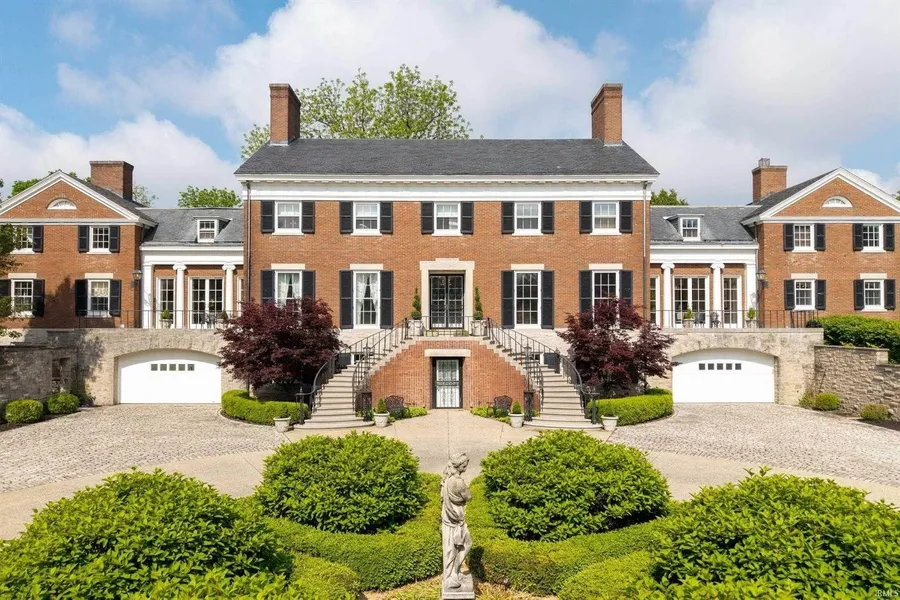 Step into this grand estate featuring over 10,500 SF of main home living space plus an attached 2,500 SF rentable apartment. Situated on 3.4 meticulously landscaped acres, this property includes three lots: 5, 6, and 7 in the private and gated Saddle Brook Estates. The house is on Lot 6. Lots 5 and 7 are valuable buildable lots. This Georgian Modern masterpiece, known as the Crapo Mansion, offers a rare blend of historic charm and modern luxury. A spectacular circular driveway and entrance of brick, granite, and masonry welcome you to the estate, setting the tone for the grandeur that lies within. Inside, you're greeted by a breathtaking foyer with a circular terrazzo staircase, hand-painted murals, imported chandeliers, intricate moldings, and rich textiles. With over 20 rooms, the home and apartment are thoughtfully designed for both elegance and comfort. Luxurious and sustainable touches include imported tiles, terrazzo floors, solid brass and pewter finishes, and eight fireplaces. A dumbwaiter system brings groceries easily from the garage to the kitchen level and could be converted to an elevator. The recently remodeled main kitchen is a chef's dream with stunning marble floors and countertops, Sub-Zero appliances, and a Wolf oven. The rich finishes flow into a grand marble-floored dining room. Step right through the 8ft French glass doors to the lush gardens, expansive patios, extensive outdoor lighting, and serene pond. Enjoy a peaceful retreat that draws in graceful deer and offers dining and comfort surrounded by nature. For relaxation or entertaining, the home boasts a basketball court, trampoline, fire pit, and a private and enclosed swim spa/hot tub with patio, perfect for year-round enjoyment. Game rooms, an attic play room, a pool table room, and an exercise room all add to your desire to stay and enjoy. The grandfathered, attached apartment is complete with its own entrance, kitchen, living area, office, laundry, walk-in California Closet, 2 bedrooms, 2 full bathrooms, a two-car garage, and storage area. This space is ideal for family, guests, or as an income-producing annual rental. Come check out this once-in-a-lifetime opportunity to own a masterpiece that captures the essence of Indiana’s architectural and cultural heritage with a home you will never want to leave. See the virtual tour to experience this amazing home.
