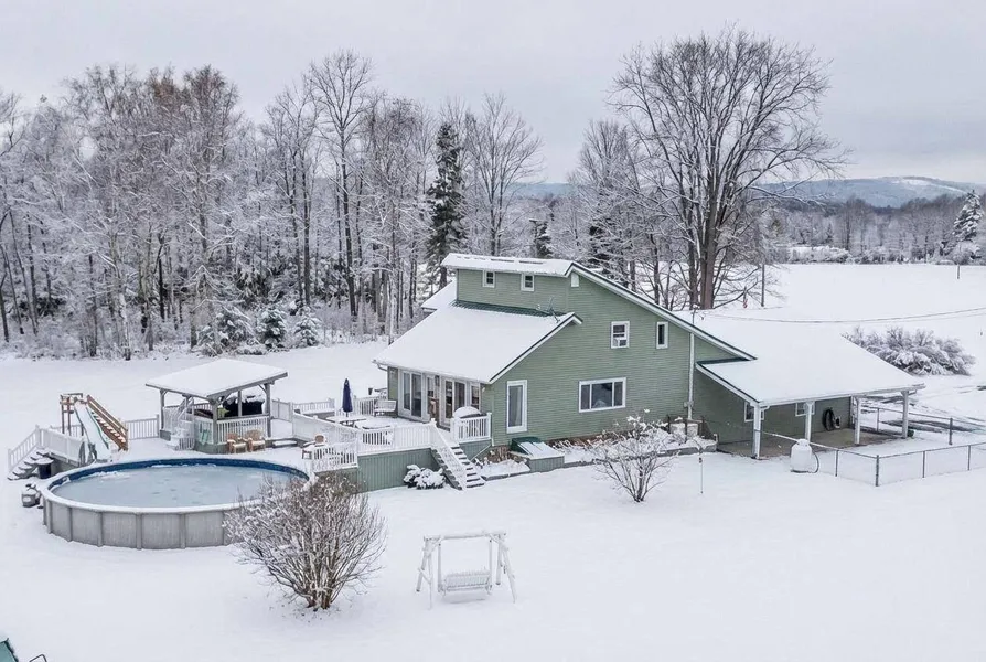 ADDED ACREAGE! Now being offered on 10+ acres in Palmyra, Maine, this custom-built, saltbox style home, offers a true retreat with the perfect mix of charm, comfort, and convenience. Just 8 miles from I-95, shopping, necessities, and local eateries—only 5 miles from the golf course, just under 9 miles to launch your boat, close to ITS 84—you can enjoy the best of both worlds: peaceful country living with easy access to town and all of your recreation needs. Inside, the heart of the home is the stunning floor-to-ceiling stone fireplace. Imagine cozy winter evenings gathered around the wood-burning fire, the glow of the flames reflecting off the rich wood beams and tongue-and-groove pine that accent the soaring cathedral ceiling. The oak stairway and balcony add timeless craftsmanship, while the open and bright living area flows seamlessly onto a spacious deck. Summer days are made for relaxing here. Enjoy your morning coffee in the kitchen's cozy breakfast nook, then step outside to the covered pavilion where the sit-up bar overlooks the sparkling 30' above-ground pool. Friends and family will love gathering here for backyard barbecues, evenings around the fire pit, or simply strolling the grounds lined with mature trees, fruit trees, and colorful perennials. With 2+ bedrooms and 2 bathrooms, the layout is comfortable and flexible. For hobbies, work, and all of your BIG toy storage, you'll find space for it all: a detached 3+ bay garage with 1 designated bay with a heated workshop, an attached 2+ bay garage with oversized door, and an additional carport. Extras like a hot tub hookup, whole-home generator, and fenced area for pets add to the lifestyle this property provides. Lovingly maintained and updated over the years with countless improvements (see full list), this home is more than a place to live—it's a place to enjoy every season, every gathering, and every moment. This one will not last! Call me today to set up your private t