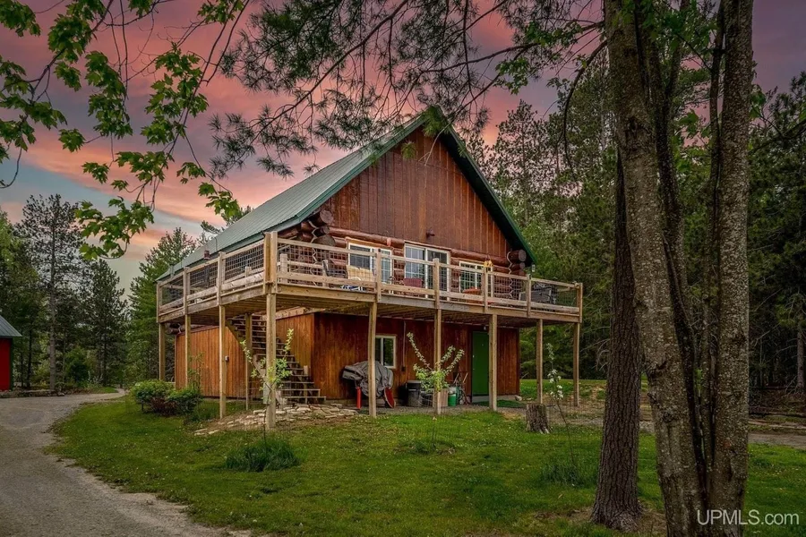 Rustic Elegance Meets Lakeside Living – Full Log Cabin on Moss Lake Discover the charm of this custom-built full log cabin, crafted in 2019 using hand-selected logs from the very land it stands on. Nestled on a picturesque lot with over 1,000 feet of private frontage on beautiful Moss Lake, this one-of-a-kind property offers peaceful water views, a sand-bottom shoreline, and prime swimming and fishing right outside your door. Step inside to find an inviting open-concept layout, highlighted by warm wood tones and a cozy loft perfect for relaxing or additional sleeping space. The walk-out basement includes a newly added non-conforming bedroom, a private sauna, and ample room to finish for more living space. Outside, a wraparound deck offers stunning panoramic views of the lake. A brand-new 30'x54' pole barn with electricity provides plenty of room for storage. The property also features a permanent water filtration system and over 25 newly planted fruit trees for your very own orchard. Whether you're looking for a year-round residence, vacation home, or family retreat, this lakefront log cabin offers unmatched beauty, comfort, and potential. Don’t miss this rare opportunity to own a slice of Northern paradise!