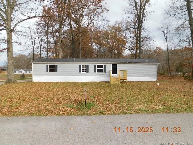 NEW LISTING!! This 1.5 acre wooded lot includes a move in ready Single Wide home located only 25 minutes from New Albany. It offers the perfect blend of country living with still being minutes away from city life. The home is a spacious 3 bedroom 2 full bath residence that has been extremely well taken care of, and comes with new Refrigerator, Oven/Range and Dishwasher. The home also includes newly built front and back wood porches and new gravel on the driveway. Seller welcomes inspections but the property is being SOLD AS-IS. Property lines are marked at each corner with orange tape tied to a post. Call today for your private showing and don't miss out on a property like this.