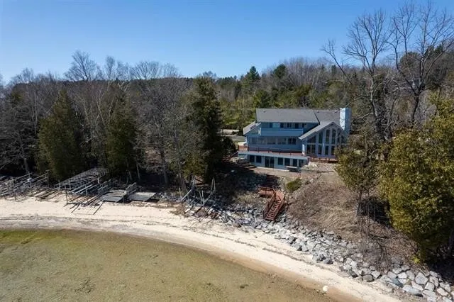 Discover an exceptional waterfront property on Old Mission Peninsula, boasting over 202' of pristine sandy shoreline along East Grand Traverse Bay. This premium beachfront offers the perfect setting for endless summer activities. Launch your kayak, paddleboard, or boat directly from your private beach, or simply dive into the crystal-clear waters for a refreshing swim in the bay. The property encompasses two generous lots in an exclusive location on prestigious Bluff Road, offering unparalleled privacy & tranquility. Experience breathtaking sunrise & moonrise views over the water from your multi-level decking system, thoughtfully designed with stairs leading directly to your private beach sanctuary. The expansive yard provides ample space for outdoor entertainment and activities. Vehicle storage is well-accommodated with an attached two-car garage plus an additional 2.5-car garage for ex...