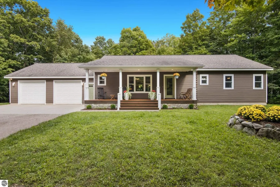 Beautifully crafted 4 BR/3.5 Bath RANCH tucked into nearly 6 wooded acres. Main floor conveniences & a fabulous finished lower level. Open island kitchen features handcrafted solid wood cabinetry & new appliances. Solid wood floors, custom created woodwork, trim & finishes. Lrg MBR suite. Main flr laundry rm + mudrm. High speed fiber optic internet is perfect for home offices. Attached oversized garage, 220V elect, insulated, heated & water. Super dual heating systems; exterior 2019 wood boiler + Acheiver 90+ forced air furnace, Kinetico water filtration system. Swing on your welcoming front porch + a large composite back deck, pergola & bonfire site perfect for gatherings. AND barn & outbuildings. Private paved rd; small neighborhood of acreage parcel homes. Located min. s to Interlochen Center for the Arts, 20 min. s to TC & Crystal MT Resort, 10 min. s to Chums Corners.
