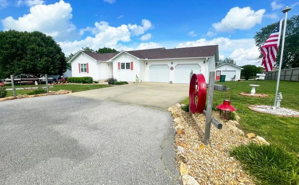 Oversized living room with elec fireplace / Dbl glass doors open to a beautiful sunroom / Kitchen comes equipped with stainless dishwasher, range, & touch panel refrig / Wood tone laminate flooring in main living area's / Owners suite has attached full bath with newer vanity, & there's a walk in closet too / Secondary Bedrooms have walk in closet - double closets / Guest hall bath remodeled 2024 / Thermopane windows tilt in for easy cleaning (kitchen has roll out for ease of opening) / Crown molding / 2 car garage: insulation added to attic, quiet raise motors on doors 2021 & pull down attic steps / Roof new 2020 -home & shop / Detached workshop: lots...