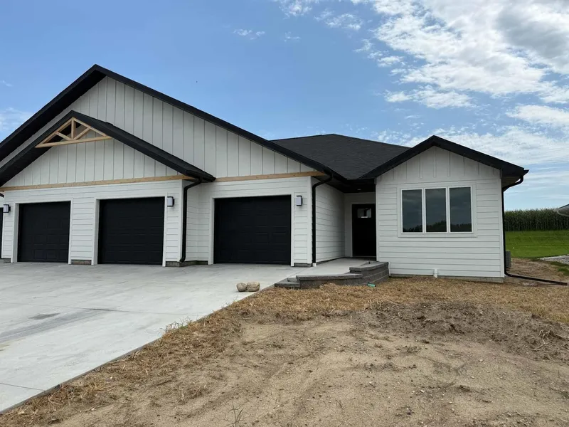 EASY LIVING. NO HOA. FULL BASEMENT. This 2025 duplex unit is designed with an effortless open layout on the main floor. It is built with 9` ceilings and a vault. A spacious covered patio is located out back which provides the perfect spot for entertaining. The main floor has luxury vinyl plank flooring with carpet in the primary suite. The kitchen boasts custom cabinetry in a nice warm color way and a tiled backsplash giving a modern look. The countertops feature quartz with a spacious island. This unit has two bedrooms and two bathrooms on the main floor. The primary suite features a walk~in closet as well as a 3\4 en~suite bathroom equipped with an onyx vanity and LOTS of storage. Rounding out the main floor is a dining space, guest bedroom, and laundry. The attached double garage is fully finished and contains floor drains. A bonus to this duplex unit is the ability to add value by finishing off the nearly 1,400 square feet basement. There`s room for a spacious living, two more bedrooms, a bathroom, and utility room. Don`t miss out on this incredible opportunity!!!!