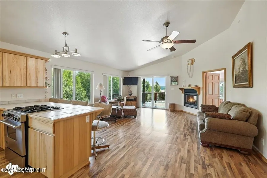 Inviting custom ranch home with big lake views, radiant in-floor heating throughout. Enjoy a large sunny deck with covered hot tub, RV parking with electric hook up, and plenty of space for Alaskan toys. Private setting near public lake access, secure fenced dog run, deep clean well, and insulated shed with power. Easily converted to ADA accessible—comfort and adventure await Custom hickory cabinets in kitchen. Oversized one car garage with built in shelving, two oversized carports. This home is built to last - Insulated quad lock foundation and 2x6 construction! Must see to appreciate the private setting and lake view!