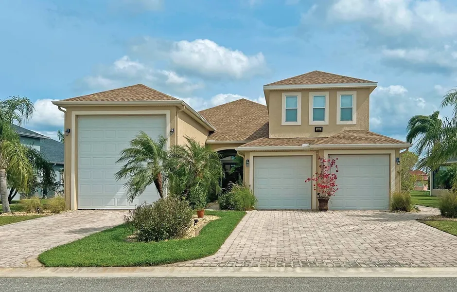 This beautiful expanded Oakwood model home is located in prestigious Hidden Lakes neighborhood of The Great Outdoors RV-Nature & Golf resort. Built in 2008, the home features poured concrete walls and 2605 sq. ft. of living area. It has an air-conditioned 14'x50' RV garage, new roof in 2025 and a 2-car & golf cart garage. Located in an exclusive gated community with a championship 18-hole golf course and many amenities including on site restaurants/bar, pickleball and tennis courts, 2 heated pools, 2 hot-tubs, fitness center, you can live in a care-free lifestyle where the low maintenance fees covers complete lawn and sprinkler system maintenance, 24-hour attended guardhouse with roaming Courtesy Patrol; water & sewer included; Spectrum internet cable DVR, daily trash pickup, miles of nature and walking trails, Doggie World, planned activities; Internet and cable tv, and an exchange library!! Centrally located on Florida's Space Coast and a short distance to Kennedy Space Center, Port Canaveral Cruise Terminals, Canaveral Sea Shore, Beaches, Orlando theme park attractions, Daytona Speedway and Orlando International Airport.