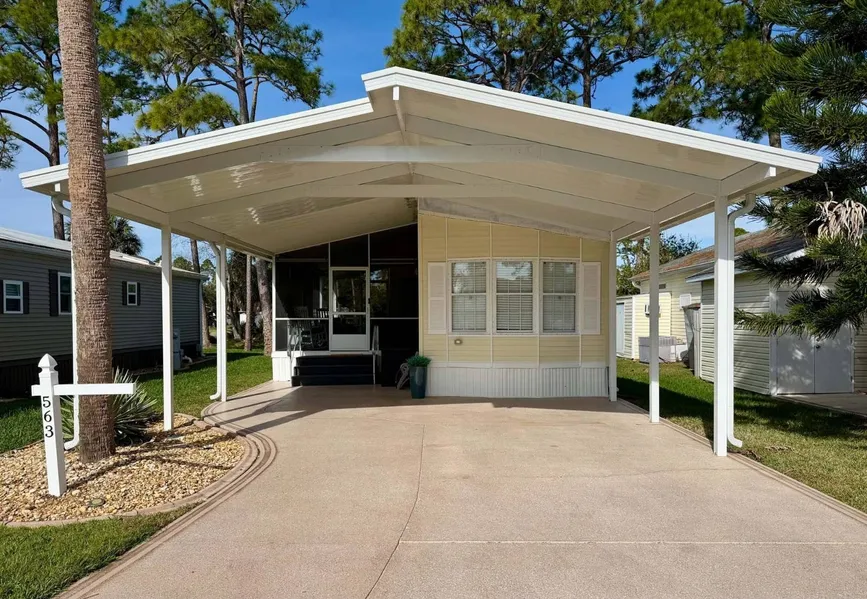 Looking for a winter retreat or full-time residence, check out this cozy 2BR/1.5 park home on quiet street overlooking lake and golf course! It features covered car/RV parking (30 amp); new roof 2024; many upgrades and 516 sq. ft. living area (newly renovate4d in 2018). Located in an exclusive gated community with a championship 18-hole golf course and many amenities including on site restaurants/bar, pickleball and tennis courts, 2 heated pools, 2 hot-tubs, fitness center, you can live in a care-free lifestyle where the low maintenance fees covers complete lawn and sprinkler system maintenance, 24-hour attended guardhouse with roaming Courtesy Patrol; water & sewer included; Spectrum internet cable DVR, daily trash pickup, miles of nature and walking trails, Doggie World, planned activities; Internet and cable tv, and an exchange library!! Centrally located on Florida's Space Coast and a short distance to Kennedy Space Center, Port Canaveral Cruise Terminals, Canaveral Sea Shore, Beaches, Orlando theme park attractions, Daytona Speedway and Orlando International Airport.