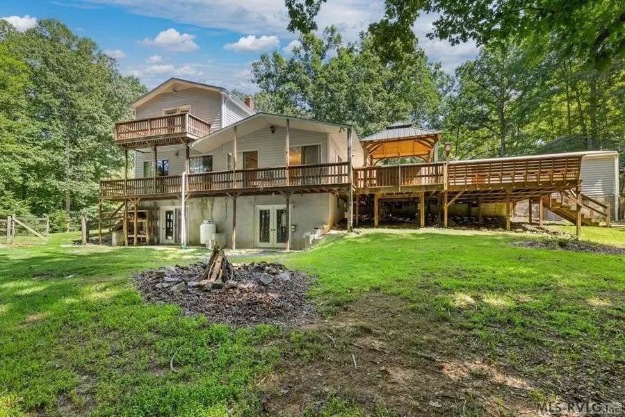 Looking for the perfect lake escape? This unique property began as a singlewide but has been thoughtfully renovated and expanded into a spacious waterfront retreat. The main level features a living room, family room, bonus/game room, eat-in kitchen, one bedroom, 2 full bathrooms, 1 half bathroom, laundry area, and an additional bonus room ideal for an office or guest space. Upstairs, the primary suite offers an ensuite bathroom and private deck with stunning lake views. The basement provides plenty of extra room for storage or future customization. Outdoor living shines with a wraparound deck, covered hot tub, and a gentle wide path leading to your dock with peaceful cove views. Additional buildings provide storage and covered parking for cars, boats, and lake toys. If you've been searching for peace, quiet, and seclusion on Kerr Lake — this is it. Schedule your private tour today!