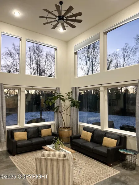 You will love the rustic feel of this Barndominium style home from the moment you enter! The large entryway features a huge walk-in closet with a custom mountain barn door. Alaskan touches throughout. The two-story living room boasts walls of south facing windows to bring in sunshine year-round. The main level Primary bedroom suite includes a large walk-in closet and private bath. The primary bath has double sinks and a separate shower with custom Prince William mountain and fireweed tiles. Stand-alone tub for the ultimate luxury. The farm style kitchen has stainless appliances, gas stove, farm sink, and a large pantry. What really steals the show is the 40X60 garage, with 18ft tall ceilings on one side for RV, a 3/4 bath, utility sink and shop. There is a steel I-beam for lifting/wench. The 12X48 patio with stamped concrete is ideal for sun bathing, morning coffee, or BBQ's. The huge f...