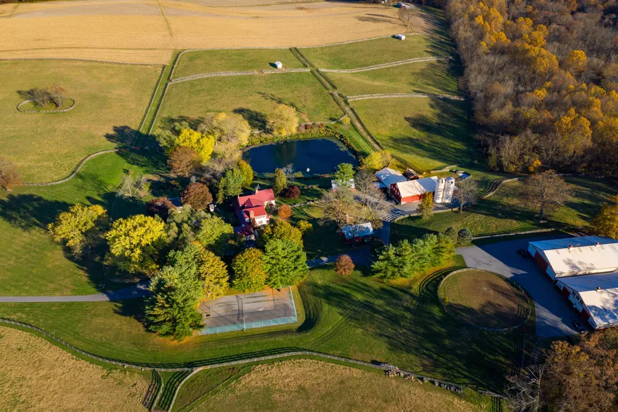 Main House is surrounded with beautiful grounds, outdoor swimming pool and tennis court. Two bedroom guest house overlooking pond is used as an office. Property has fenced paddocks, Historic Barn with 24 Stalls, Caretaker's two bedroom apartment and two large buildings for farm equipment