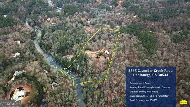 Norton Commercial & Acreage Group is proud to present a rare 9-acre riverfront homesite located at 5565 Cavender Creek Road in Dahlonega, Georgia, within the Rural Places Character Area. This exceptional offering presents an opportunity to create a one-of-a-kind private residence in a setting defined by natural beauty, privacy, and long-term preservation. The property features some mountain views and over 350 feet of frontage on the Chestatee River, including picturesque shoals and the ambient sounds of running water that can be enjoyed from the primary homesite. An established gated entrance and paved driveway are already in place, providing convenient access and enhancing the property's sense of privacy from arrival. The wooded setting and varied terrain create an ideal canvas for a thoughtfully designed custom home or legacy property, with topography and river orientation that support elevated views and a strong connection to the surrounding landscape. In addition to its appeal as a private retreat, the property also offers potential for short-term rental or agritourism-oriented use, benefiting from continued demand for North Georgia mountain stays that emphasize water features, views, and outdoor recreation, subject to local regulations. Location Description Located just outside downtown Dahlonega, the property provides easy access to the historic square, the University of North Georgia, regional healthcare, dining, and retail, along with nearby wineries, waterfalls, and outdoor recreation. Connectivity to regional roadways allows for access to Gainesville and the greater North Georgia region, while preserving the privacy that defines this exceptional homesite.