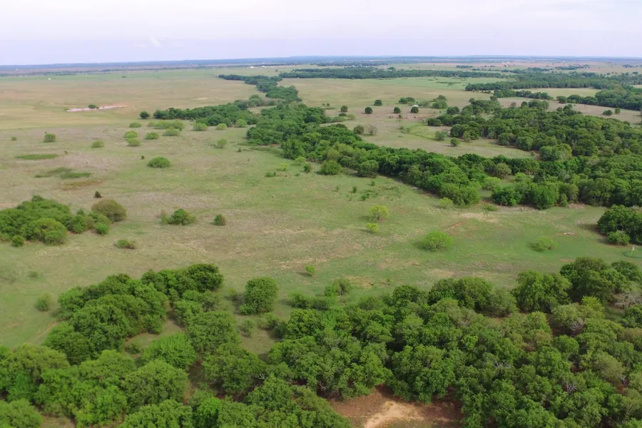 Approximately 75 acres on the north side was cleared at one time and is mostly in native grass. Young mesquites and scattered locust trees can be found across this area, and there is a large pond on the far north side where a draw is. The remainder of the acreage is in heavy woods, with open meadows and smaller fields in between the creek ravines on the east side. Some of these trees are so thick you can't hardly walk through them! Lots of oaks, elm, and pecan make up this forested area.