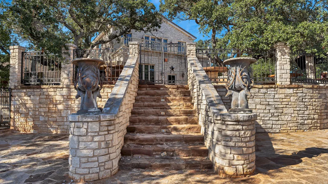 The Rock Lodge is one of a kind, consisting of a main house approx. 6800 SF along with a guest house approx. 1230 SF and oversized rock garage/workshop and storage area approx. 2400 SF. All improvements are 100% masonry stone with high ceilings and tile roof. Expansive rock courtyard with rod iron gates and mature Oak trees wrap around the main house and guest house. Main house consist of 3 Bedroom/5 Bath, with a master suite upstairs and master suite downstairs. Guest house is a 1 bedroom/1 bath. The "GRAND" Great Room is 1728 SF with custom wood paneling and cabinetry, massive fireplace, hardwood floors and stunning staircase. The Master suite upstairs is approx. 1579 SF including fireplace, custom walk thru closet with laundry, master bath with dressing area, large tub, separate shower, double vanity and private balcony overlooking the courtyard. The downstairs master is approx. 800 SF along with a private study/sitting room with fireplace and laundry approx. 450 SF. The compound is ideal for large gatherings and entertaining.
