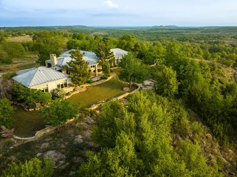 Landscaping: Property is well landscaped with a rock wall surrounding the yard. Stone walkways and steps from the porch to the yard lead down to the stone firepit and patio. Grasses in the yard are lush and good to walk on barefoot. Variety of ornamentals and shrubs are planted and trees include Afghan pines, live oaks, and cedar elms. There is also a massive post oak outside the master bedroom window with big views over the northern 150 acres of the property.