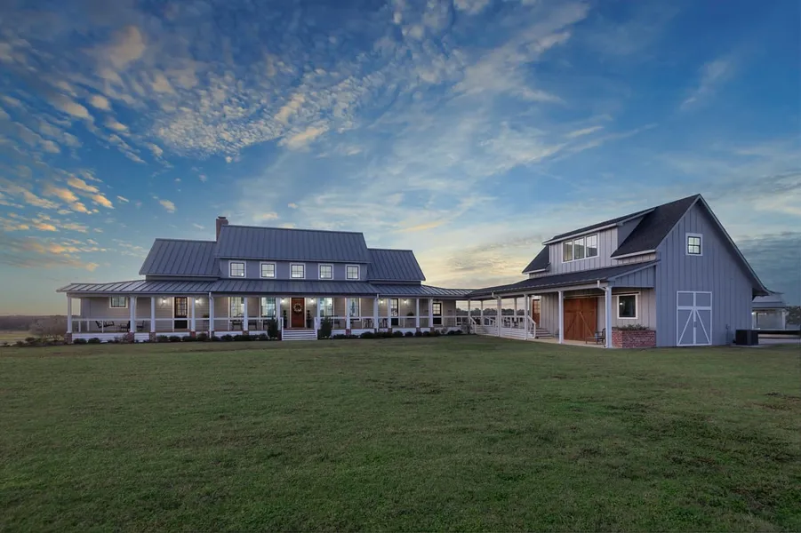 At the end of a 1.2-mile driveway sits a luxurious retreat atop a lush hay meadow. Completed in 2020, the custom-built home is an updated version modeled after the 2013 Southern Living Idea House, which is now a boutique hotel outside of Nashville. The estate offers endless possibilities for living arrangements and provides the perfect setting as an entertainment venue. From its eye-catching drive-up appeal to the attention to detail, this is a standout stunner unlike a typical ranch house. The massive front porch is a welcoming space ideal for gatherings of any size. Its impressive front and back doors open directly into the two-story high Great Room with an open floor plan and wood burning fireplace. The gourmet kitchen features a large center island with dine-in seating, soft-close custom cabinets, and five-star appliances. An inviting bar with both wine and beverage refrigerators and a farmhouse style coffee bar ensure all guests are comfortable. Just off the kitchen is a light-filled sunroom with French doors opening to the inviting back porch featuring a full-size swing bed for sunset enjoyment. A Dutch door offers a separate entry from the front porch into the mud and laundry rooms where there is an abundance of storage. All fixtures and hardware throughout the home have been procured with care. The impressive library with its thirteen-foot-tall ceiling offers a more intimate setting. The primary suite is ideal and showcases a spa bath and custom designed walk-in closet.
