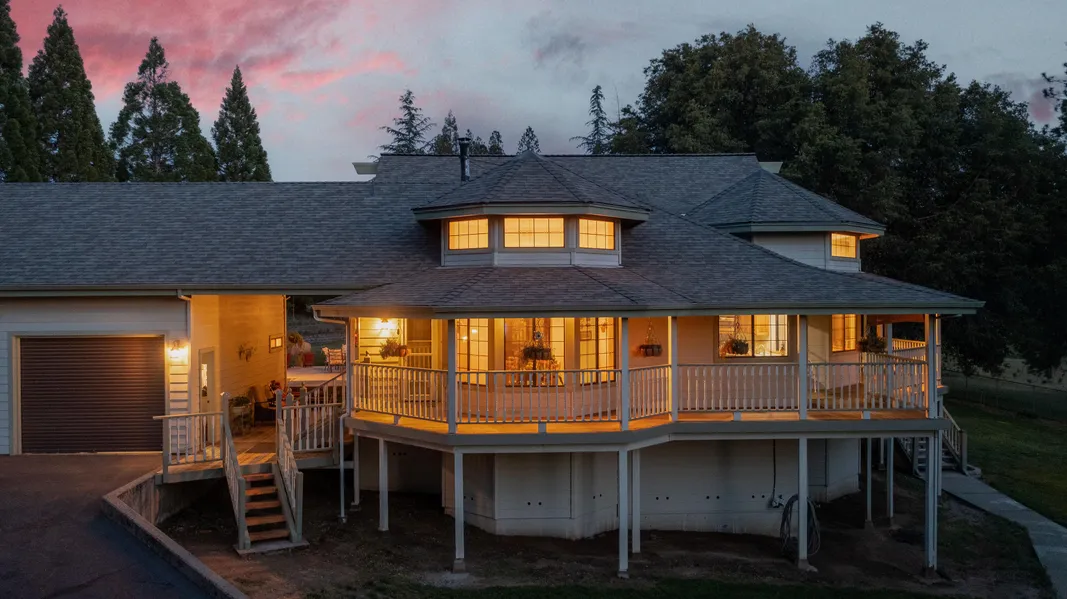 This stunning property boasts 10 acres of rolling pastures, dotted with stately oak trees. The 3301 square foot home features 3 bedrooms, with a loft that could serve as a bonus or office space. The spacious country kitchen is perfect for entertaining, and the formal dining room is ideal for special occasions. The living room is a showstopper, with soaring vaulted ceilings, beautiful woodwork, and a convenient wet bar. Step out onto the spacious deck which overlooks the tranquil backyard, with its lush lawn and mature trees. The prime suite is both spacious and luxurious, with an updated bathroom that includes a claw foot tub, large shower, and all the amenities one could desire. The attached 3 car garage is connected to the house by a breeze way and includes a full updated bathroom. The workshop can be used as a shop or barn, and there is plenty of room for animals, gardens, and outdoor...