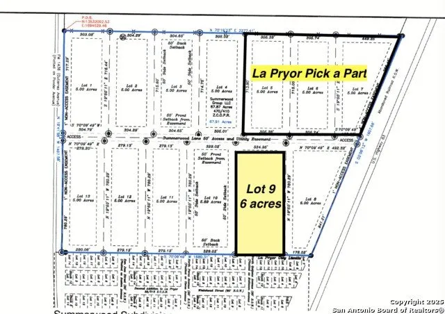 New "Summerwood Subdivision" in La Pryor, Tx offering unrestricted lots from 1-6 acres. This Lot 9 is suitable for a residential homesite, commercial, agriculture or whatever you choose as it is unrestricted. Water and electricity will be available at the street. Property tax information is not yet available as taxes have not been assessed yet.