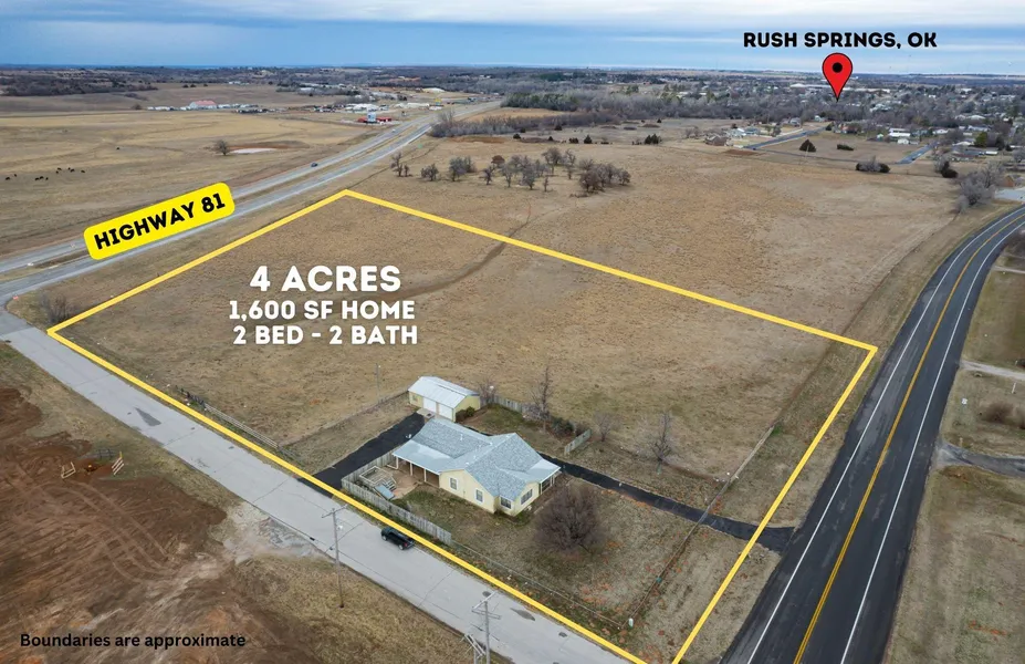 Cute 1,600 SF 2 bed/2 bath home on South Rush Avenue on the south side of Rush Springs, OK. There is road frontage on 3 sides, including highway 81 on the west. This home sits on 4 acres and additional acreage could be added. The home is in great shape and just needs a new owner to add their personal touches...and this one is priced accordingly. There is a huge main living area as well as a large study that could be used as a second living area. The location has convenient access to Chickasha, Duncan, and is less than an hour from OKC. There are 99 additional acres also for sale.