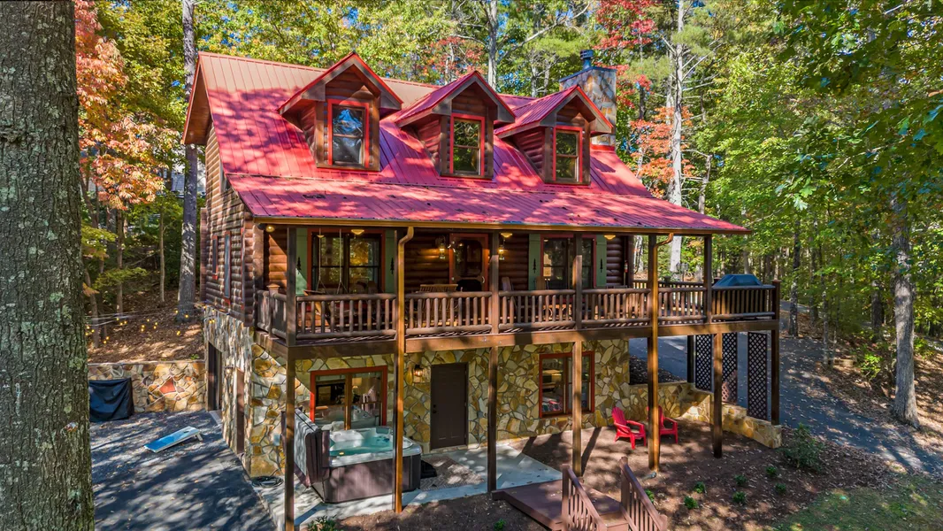 Located in the desirable, gated community of Goose Island Hideaway, this FULLY FURNISHED cabin makes for a perfect full-time residence, second home, or rental investment. The cabin was professionally decorated and furnished in 2023. Conveniently located between Blue Ridge and Ellijay, only a couple miles off the main corridor, SR 515, everything is just a short ride away. As you cross the covered bridge over the Ellijay River, the fully paved streets leading up to this true log cabin are nothing but inviting. Complete with three full bedroom suites, an additional fourth bunk room loft/game room, an open-concept floor plan features soaring ceilings with impressive beam work, an entertainer’s kitchen, and ample outdoor living areas. This custom cabin was built with quality in mind. From the live edge wood staircase, the hand turned bannisters, granite countertops, and whole home generator – no expense was spared. The recently finished lower level includes a game room, wet bar, hot tub, and a custom glass door that opens to the impressive fire pit area complete with magical string lighting. This private, wooded oasis is located near the Benton Mackaye Trail and other highly sought-after hiking and biking areas. Call today for an exclusive tour and experience the mountain life as it should be lived.