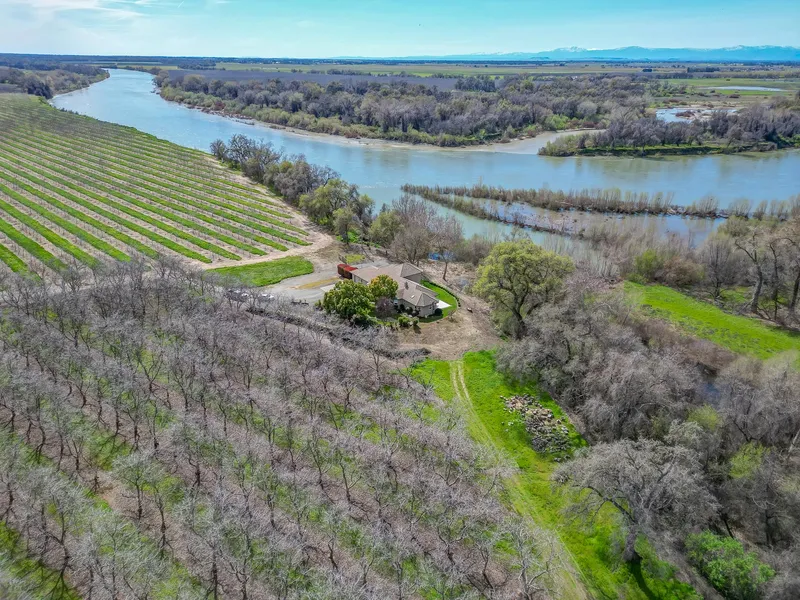 78 +/- acres of Class 1 soil on the Sacramento River between Chico and Red Bluff. 76 +/- acres of fertile soil are planted to producing Chandler walnuts. On the east bank of the Sacramento River is a 2,500 square foot two-story custom home with three car attached garage. East Chandlers: 58 +/- acres planted in 2008 to Chandler, paradox rootstock. These 16-year-old Chandlers are in good condition with few replants. The block is irrigated with above ground tubing and Nelson P6-15 micro sprinklers. The block is irrigated in 3sets. West Chandlers: 18 +/- acres planted in 1998 to Chandler, paradox rootstock. These 26-year-old Chandlers are in good condition for age, some missing trees, few replants. The block is irrigated with buried tubing and Nelson P6-15 micro sprinklers. Orchard is irrigated in 1 set. Combined 3-year average production is 4,117 in-shell pounds per acre. 2023 production was 4,741 in-shell pounds per acre. There are two wells. The 1994 drilled 12 cased irrigation well is completed to a depth of 220 with a 6-cylinder John Deere diesel engine and 60 Hp Johnson 1:1 gearhead. Water for home and landscaping is provided by a 6 domestic well with submersible pump. Constructed in 1994, this two-story 2,500 foot home has 3 bedrooms, 2 full bathrooms, 2 half bathrooms, plus sunroom and attached extra deep 3 car garage. Off the centrally located kitchen with island and surrounding bar top is the living room with a woodstove, dining room, laundry room and sunroom. Both upstairs bedrooms have beautiful views of the Sacramento River. The downstairs master bedroom has its own bathroom with Jacuzzi tub, walk in closet, and gas stove. Across from the master is an open room previously used as an office. Additionally, the home has 2 HVAC, large front and back lawns, with maintainable landscaping.