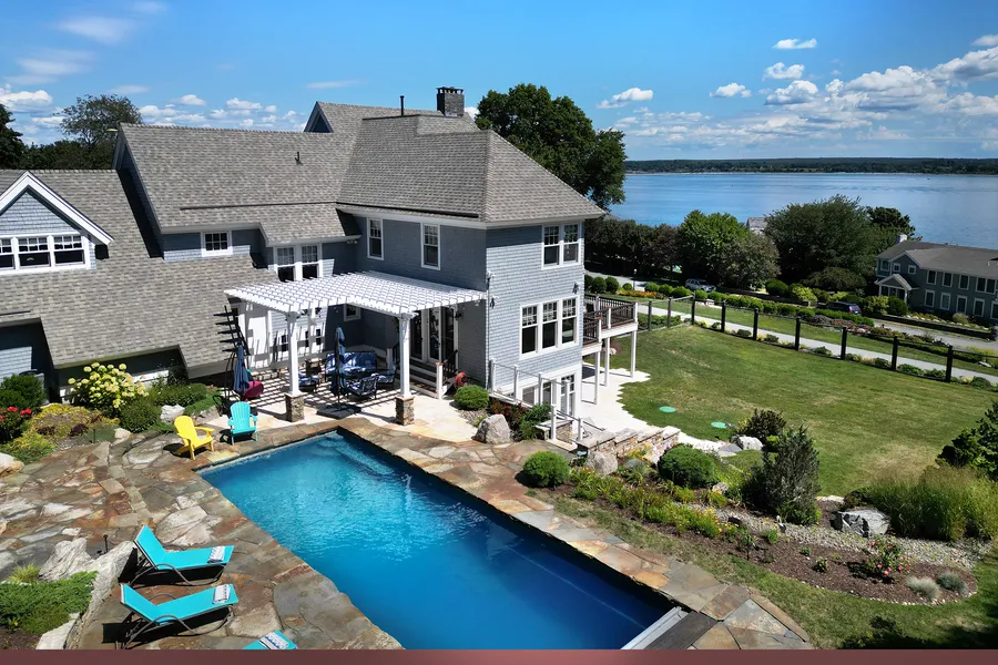 Custom coastal home with Sakonnet River views in sought after Sandy Point Neighborhood. Fully remodeled just 7 years ago, this home combines timeless craftsmanship with dramatic architectural design. Throughout the home, hardwood floors, solid materials, cabinetry and coffered ceiling elevate every space; While signature curved details, including a sweeping staircase, rounded powder room wall, and curved master shower—create a sense of flow and artistry. At the heart of the home, a chef’s kitchen with an expansive walk-in pantry and center island seating opens to the great room and dining area, all positioned to capture sparkling Sakonnet River views to the East and private landscaped grounds and pool in the west/rear. The primary suite offers a wall of windows to the water, a spa-worthy bath with soaking tub and glass shower, and a custom walk-in closet. Additional en-suite provides ide...