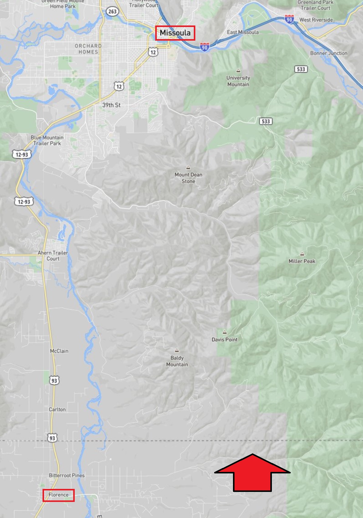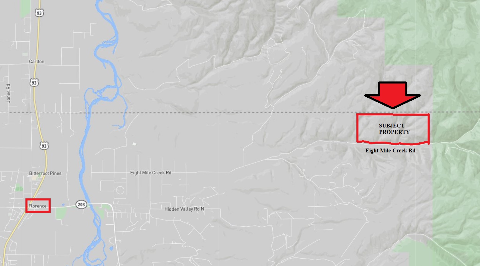 Research Parcel InformationFrom Missoula go south on Interstate 93 South approximately 17 miles to Florence, then east 7 miles starting on hwy 203, then North / left onto Eight Mile Creek Road and the property is on the North & South sides.