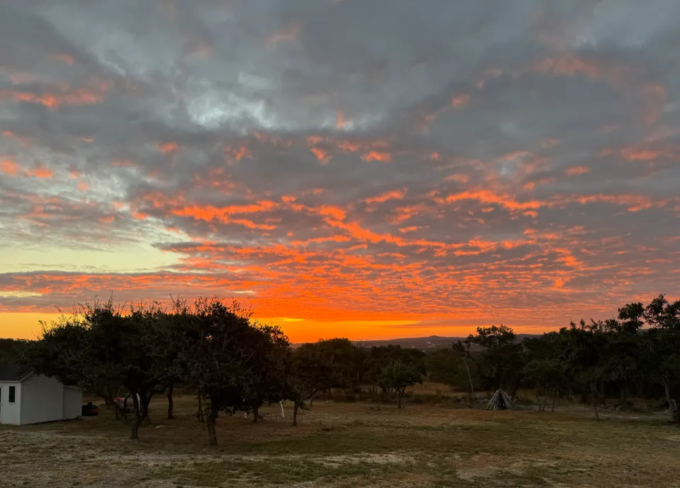 Nearby rolling terrain provides scenic Hill Country views, and the setting delivers beautiful sunrises that bathe the land in a warm, golden light. The property is dotted with plenty of mature oak trees, offering shade, character, and a timeless Texas feel.