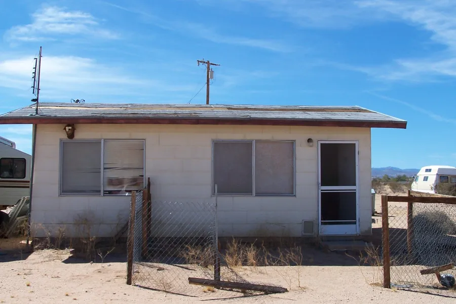 This cabin has seen better days. The tires on the roof that were to keep the shingles from blowing off, collapsed the ceiling in the kitchen. The rest of the house is fine. It is being sold in its present condition. It has a living room, kitchen, one bedroom and one bathroom. Fix this house and it could be a very cute cabin again. The views are great from here and it is 2.5 acres of all usable land. It is only 1.25 miles on a dirt road and about 20 minutes into downtown Yucca Valley or Joshua Tree from here, great location. Don't Wait - Call Now!!